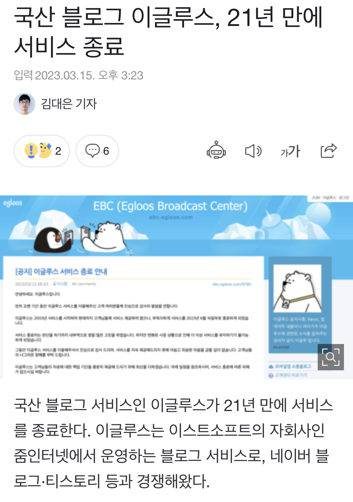 이글루 by EYANST 카테고리 없음 2023.03.25 Egloos 블로그가 문을 닫는다. 블로그인닷컴에 이어 또 하나가 저문다. 그렇게 나의 기억들도 저문다.내가 살던 시대가 간다. 공유하기 게시글 관리 eyanst_blah 블로그의 정보 아날로그 인간의 디지털 블라블라 EYANST 활동하기 댓글 공유하기 다른 글 공유하기 카카오톡 카카오톡 LINE LINE Twitter Twitter Facebook Facebook 카카오스토리 카카오스토리 밴드 밴드 네이버 네이버 Pocket Pocket 다른 글 다른 글 더 보기